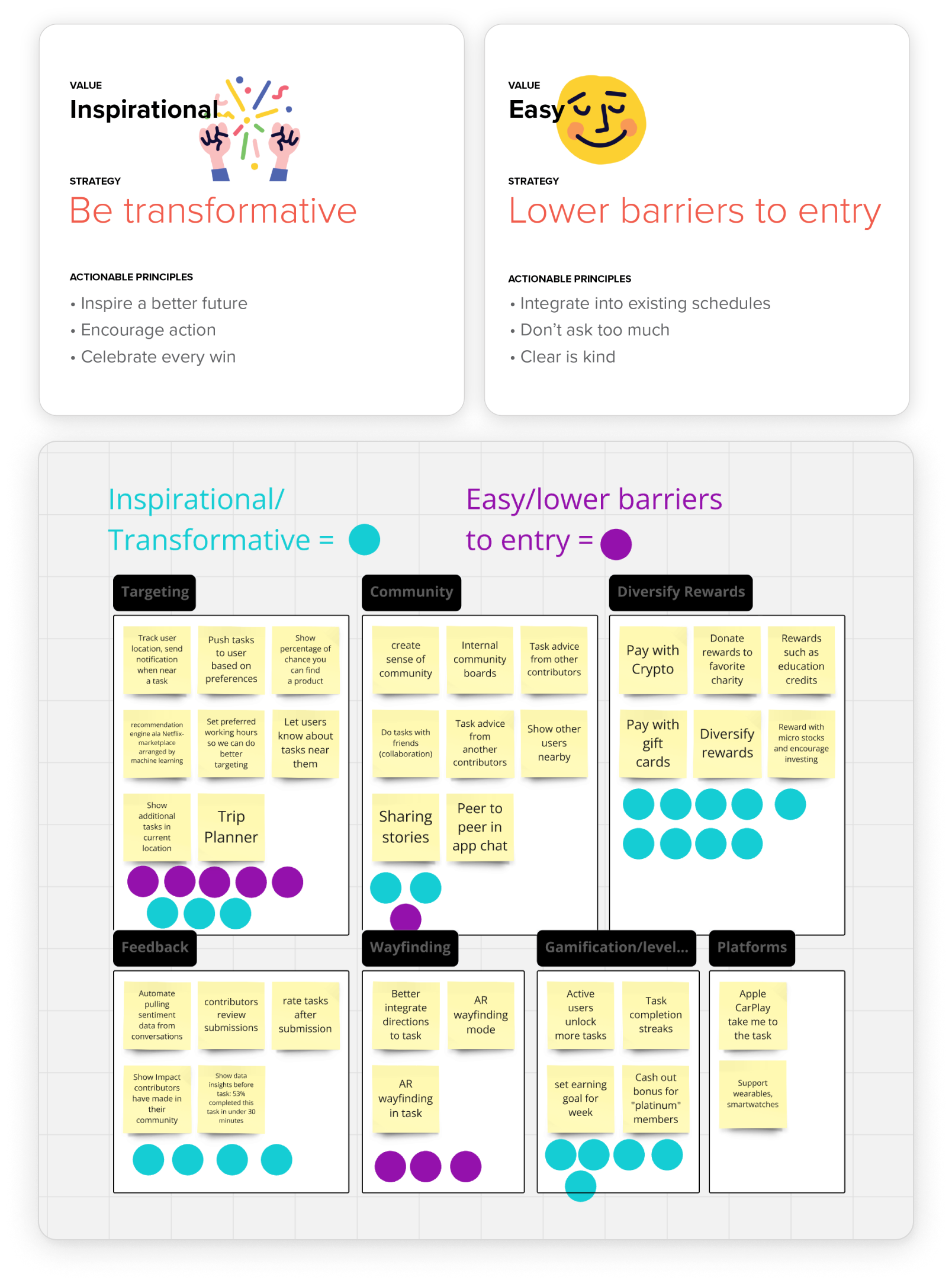 Cross functional workshops resulted in a wealth of ideas for increasing network size. We always start with design values, so the design team clustered the ideas then voted for what we believed most aligned with our design values: 1) Inspirational and 2) Easy.