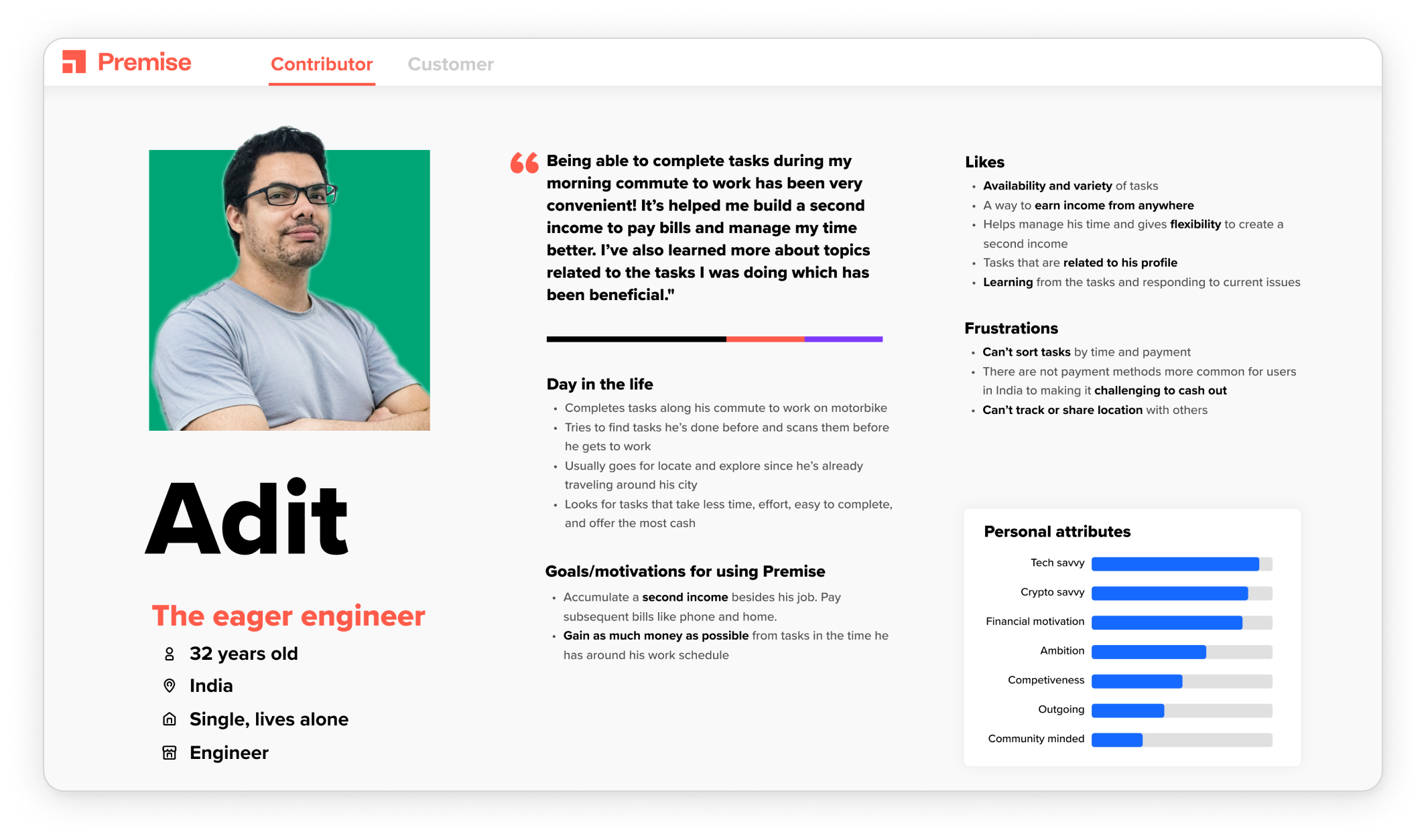 We chose trip planner because Adit uses Premise on his morning commute and needs to find tasks along his route.